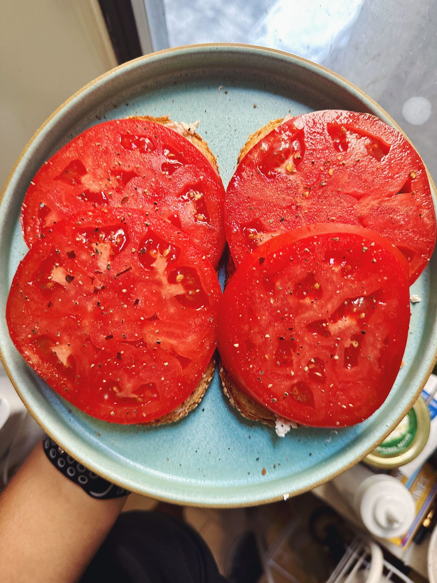 An egg and cheese on a scallion bun for dinner at Golden Diner with a friend, and some pistachio scotcheroos she pilfered from the Bon Appétit test kitchen for me (I miss being there for daily tastings). A giant chicken quesadilla from Metro Diner (went on a run, procrastinated on eating, this was the first meal of the day), a cookie sundae at Junior’s before finally seeing Stereophonic on Broadway (a fantastic play). A park picnic spread of crackers, cheese, and bubble tea. Fistfuls of popcorn stolen from a friend during Between the Temples. I bought some beautiful tomatoes from Millport Dairy and made this garlic-rubbed tomato toast.